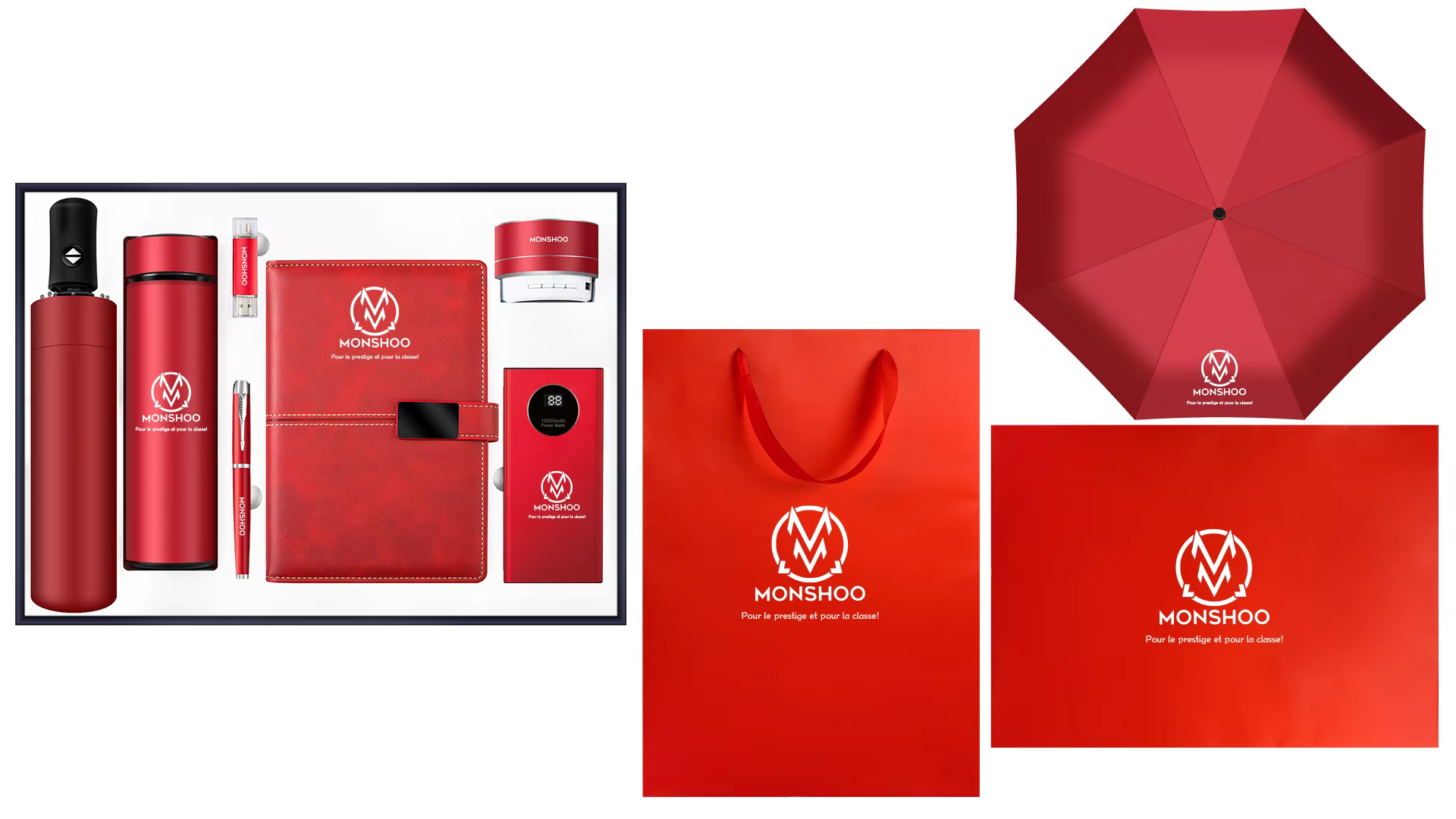 Ce coffret offre 7 articles indispensables : Parapluie, Bouteille inoxydable, Clé USB (32 GB), Stylo, Carnet, Haut-Parleur, Banque d’alimentation (10000mah).